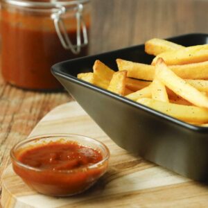 En effet, celle-ci est à base de concentré de tomates, vinaigre, sauce soja, paprika fumé et piment et légèrement sucrée. En effet, j’ai remplacé le ketchup par du concentré de tomates et le sucre par du sirop d’agave (sinon du sucre de coco).
