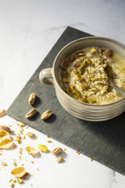- Enfin, ajoutez les pistaches concassées. Goutez et ajustez l’assaisonnement en sel, poivre et épices, à votre convenance et mélangez. Puis transvasez ce houmous dans un bol et placez-le au réfrigérateur jusqu’à l’heure de l’apéritif…